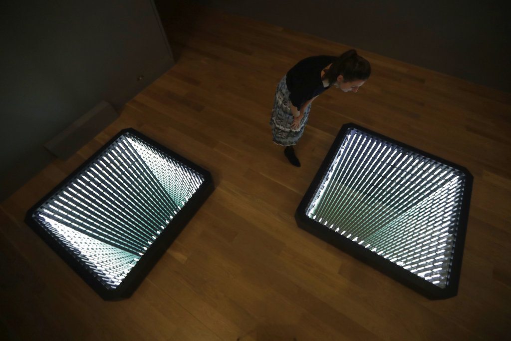 A staff member poses for photographs looking at Chilean-born artist Ivan Navarro's two light box and mirror installation "The Twin Towers" during the media preview for the "Age of Terror: Art since 9/11" exhibition at the Imperial War Museum in London, Wednesday, Oct. 25, 2017. The exhibition, which runs from Oct. 26 until May 28, 2018, considers artists' responses to war and conflict since the attacks of Sept. 11, 2001. (AP Photo/Matt Dunham)