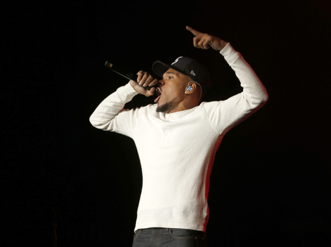 FILE - In this Nov. 1, 2018 file photo, Chance The Rapper performs during a community concert at the Obama Foundation Summit in Chicago. Chance the Rapper is so serious about raising money for arts education programs in Chicago that he took a second job: Lyft driver. The Chicago-born Grammy-winning hip-hop artist who's given millions of dollars to the school district recently went undercover as a Lyft driver to make a video that encourages riders to donate to the arts programs in the city's public schools. (AP Photo/Charles Rex Arbogast, File)