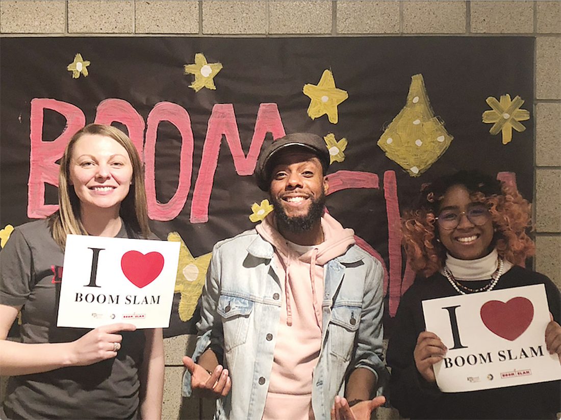 Submitted Photo Teacher and organizer Teresa Marquart, organizer and spoken word poet Joe Davis, and Gabrielle Johnson, Boom Slam! Winner, are shown in this photo.