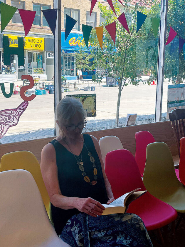 Jen Brodal/MDN Val Stadick, owner of Main Street books in downtown Minot, pages through her big title, "Cloud Ku Ku Land,” a recommended read, at the front window of her shop.