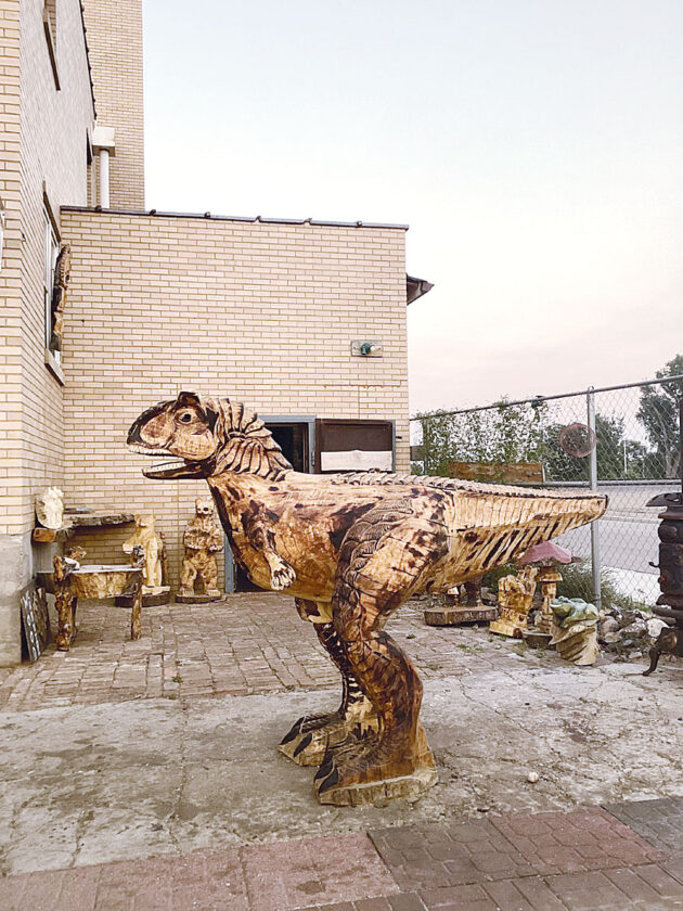 Submitted Photo The Dino sculpture pictured was designed and executed by local artist Cody Carlson, owner of Grateful Spaces Studio. His work will be on display and he will be doing live demos throughout the Logger Fest.