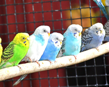 A group of the parakeets of the Pretty Bird Paradise live parakeet interactive educational exhibit rest on one of many branches in the huge walk-in enclosure where people could come to interact with the birds and feed them with food on a clothes pin. The exhibit at the recent 37th annual Sports & Recreation Show in Williston drew an endless crowd of all ages. Photo by Roger Riveland.