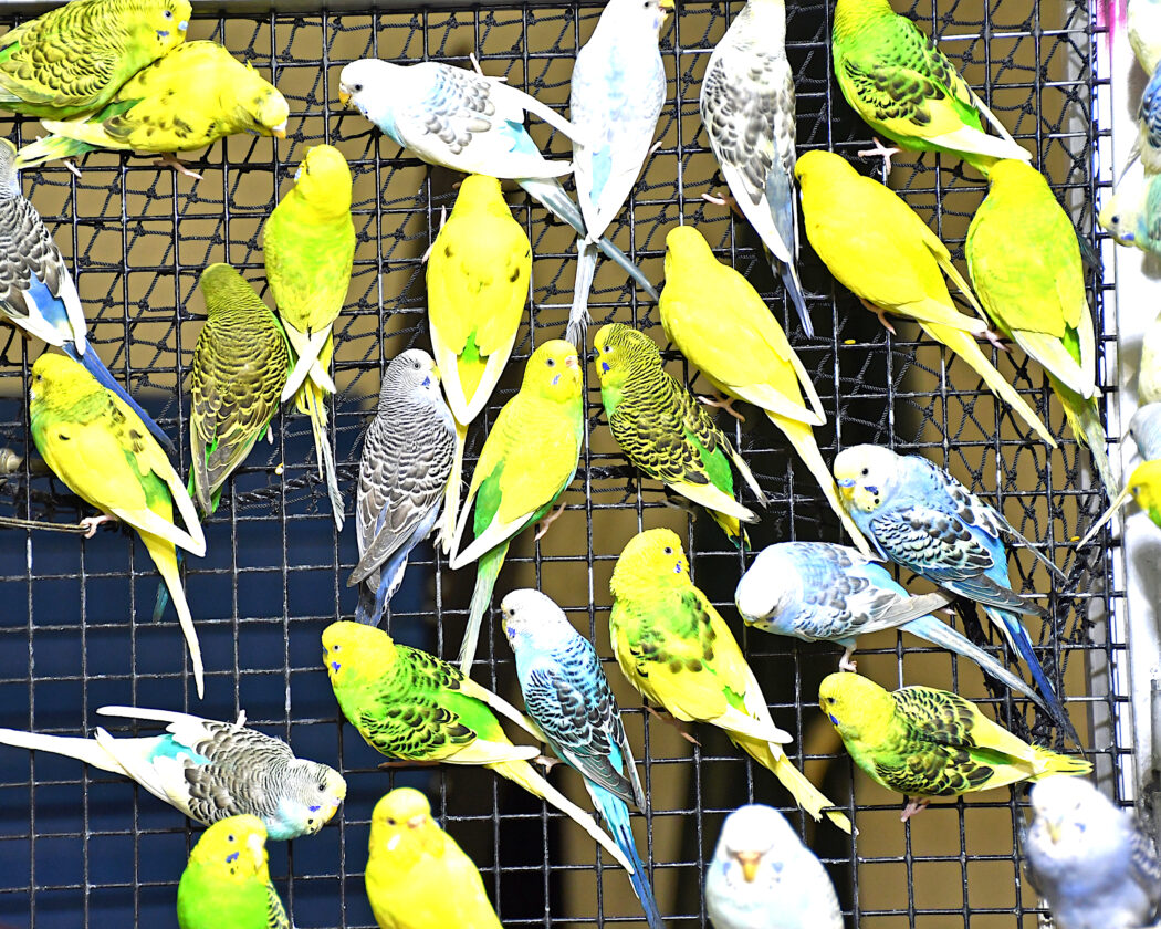 A number of the Pretty Bird Paradise live parakeet interactive educational exhibit cling to the side of the huge walk-in enclosure where people could interact with the birds and feed them with food on a clothes pin. The exhibit was a feature at the recent Annual Sports & Recreation Show in Williston. Photo by Roger Riveland.