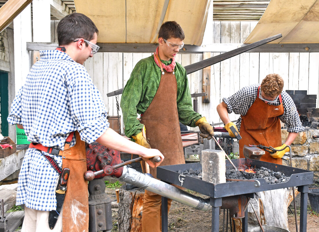 Young blacksmiths, from left to right, Seth Hussey, Minot, and Garrick "Gunny" Halvorson and Jayden Halvorson, both of Sidney, Mont., show their metal working craft to attendees at the Fort Union Rendezvous held Thursday-Sunday. Gunny Halvorson is heating up a piece of metal to be worked in the forge while Hussey turns the blower to make the coals hotter. Photo by Roger Riveland.