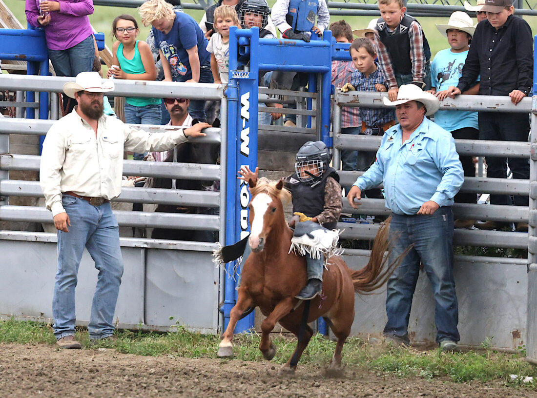 Ryker King shows the crowd how to turn a horse loose at the MHA Youth Rodeo Association’s Mandaree Youth Rodeo. Ryker’s mother, Bailey King, is also a barrel racer and they are from Standing Rock Reservation. The event was held Saturday during the Mandaree Celebration.