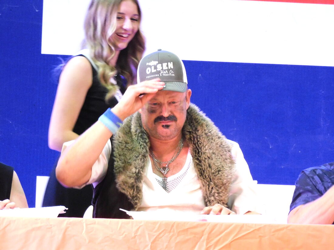 - Wendy Harper/MDN First-place winner Frode Tilden of Fargo, front, tips his Olsen Fish Company hat after winning the lutefisk eating contest Saturday Sept. 27, at Norsk Hostfest. He is joined by Miss Norsk Hostfest 2025 Erica Littlefield, back.