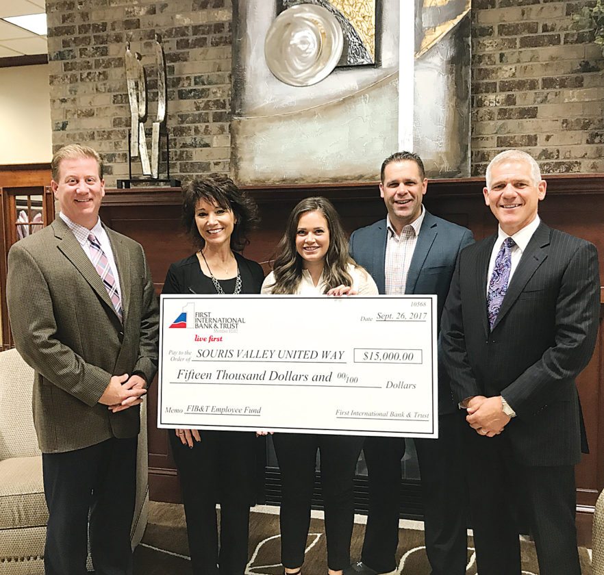 Kent Olson/MDN Pictured from left to right in the photo are: John Drady, Denise Larson, Danielle Rued (Campaign Coordinator for SVUW), Perry Olson and Blaine DesLauriers. The Minot First International Bank & Trust office presented Souris Valley United Way with a check for $15,000.00 from its Employee Fund. “We are proud to be a longtime Premier Sponsor to SVUW. This is just one more way that FIB&T demonstrates our mission to give back to the community that we live & work in,” the company said in an announcement.
