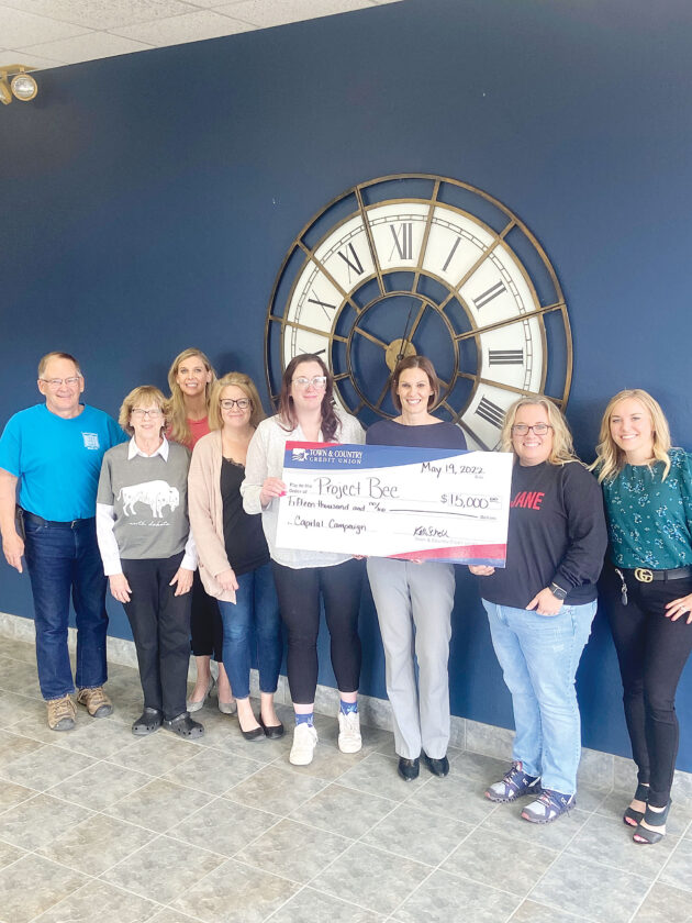 Submitted Photo Town & Country Credit Union representatives present a symbolic check for a $15,000 donation to Project BEE and The Lord’s Cupboard representatives. From left are Gerald Rosie and Mary Carlson, The Lord’s Cupboard; Shannon Webster, senior vice president of marketing, credit union; Calla Abrahamson and Executive Director Liz Larsen, Project BEE; Kalli Schell, interim president/CEO, credit union; Connie Wilson, Project BEE; and Stephanie Silverthorn, vice president of human resources, credit union.