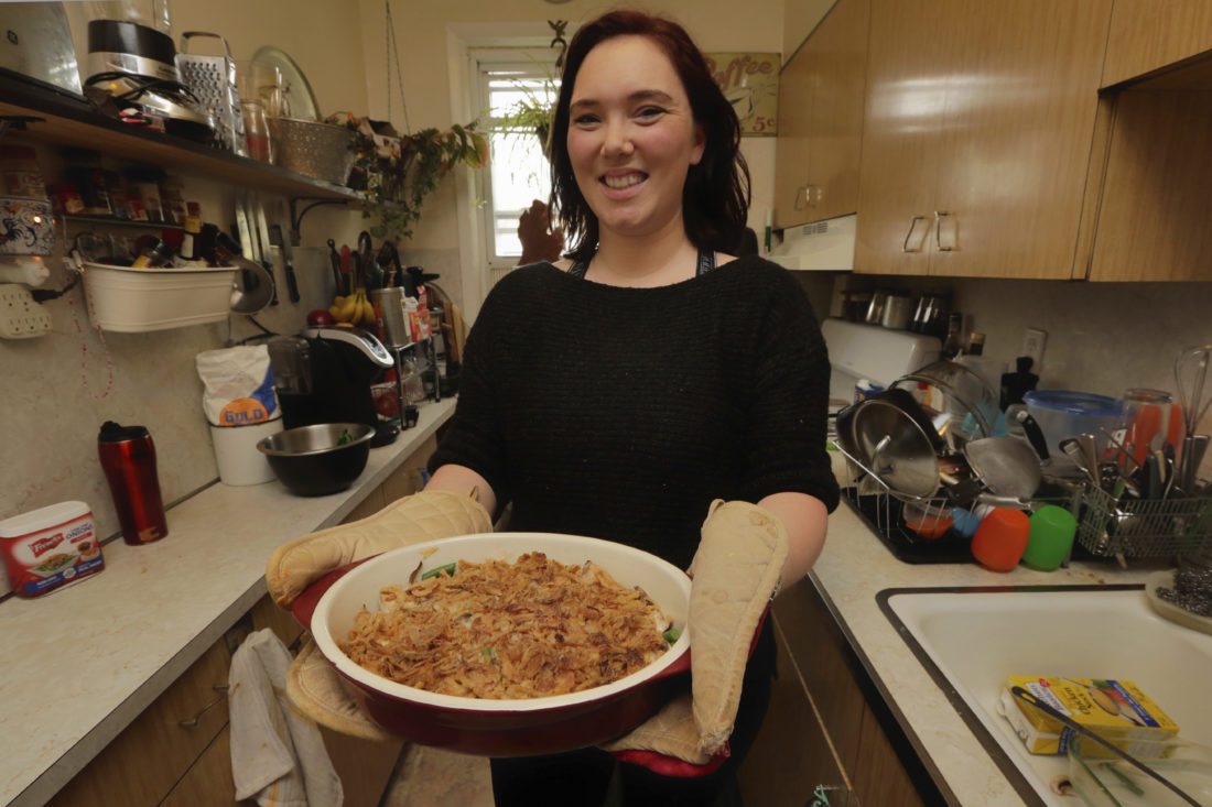 Ruthy Kirwan, of Percolate Kitchen, shows off the her version of the classic Thanksgiving favorite Green Been Casserole, in her apartment kitchen in the Queens borough of New York, Wednesday, Nov. 8, 2017. Before actors perform a play for an audience, they run a dress rehearsal to look for kinks that need fixing before the show opens. Traditional Thanksgiving dinner is a big production that can benefit from rehearsal, too, say some veteran hosts. (AP Photo/Richard Drew)