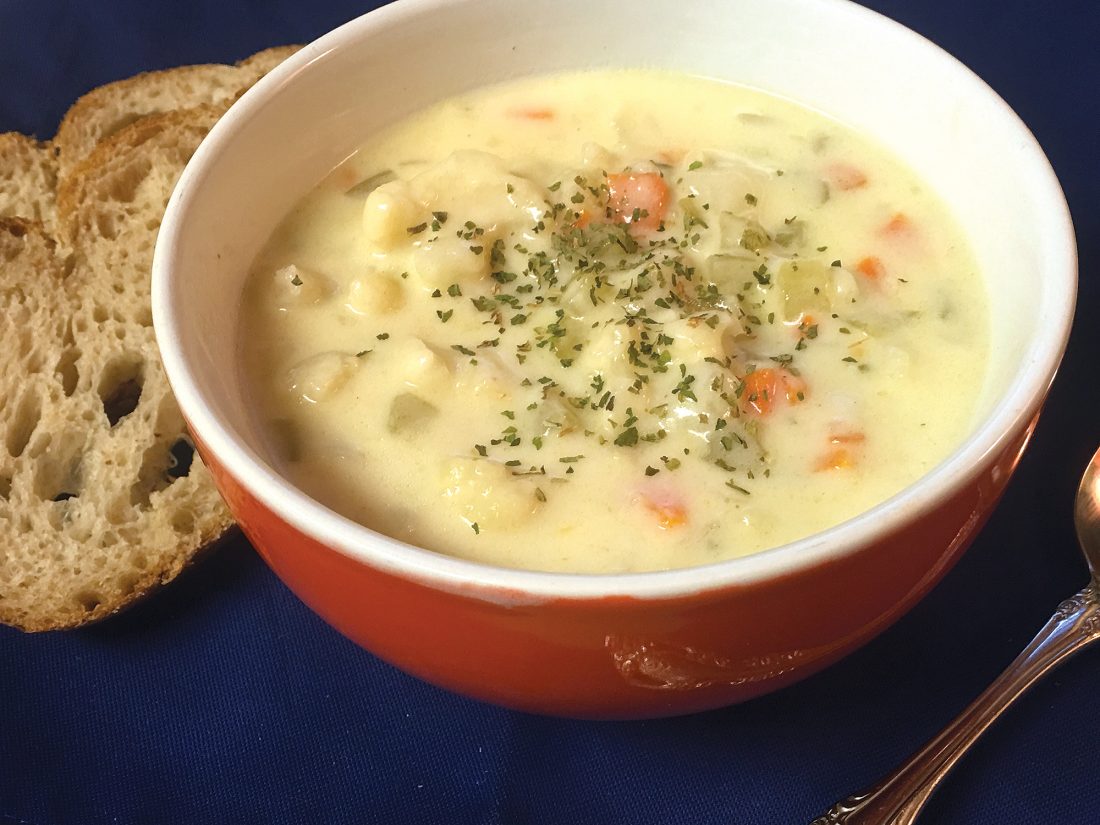 In medium sauce pan melt butter. Stir in flour to make a thick paste. Blend with wire whisk, gradually add milk. Cook and stir until thickened and smooth. Remove from heat; stir in half-and-half. Stir sauce into simmering soup. Season with salt and pepper and simmer about 12-15 minutes or until cauliflower is tender. Mix about 1/2 cup of soup into sour cream. Stir sour cream mixture into soup. Reheat and sprinkle with remaining parsley. This yields 10 cups. Serve with your favorite warm crusted bread.