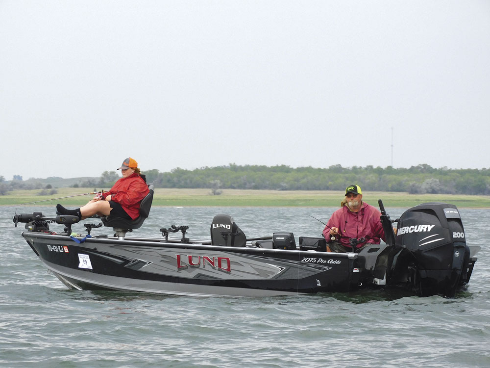 Kim Fundingsland/MDN Berkley and Carey Gieser, Garrison, during this year’s Governor’s Walleye Cup Tournament on Lake Sakakakwea. The team finished 27th in the 260 team event.