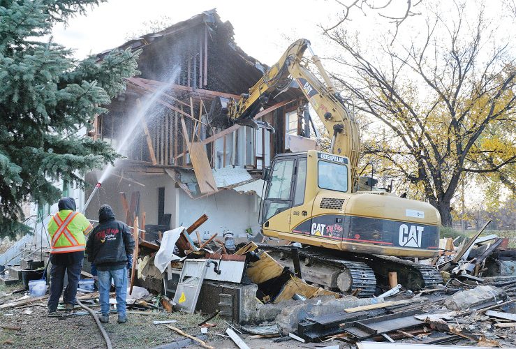 A building that once served as Minot’s original St. Paul’s Lutheran Church came down Monday, making way for the flood protection project.