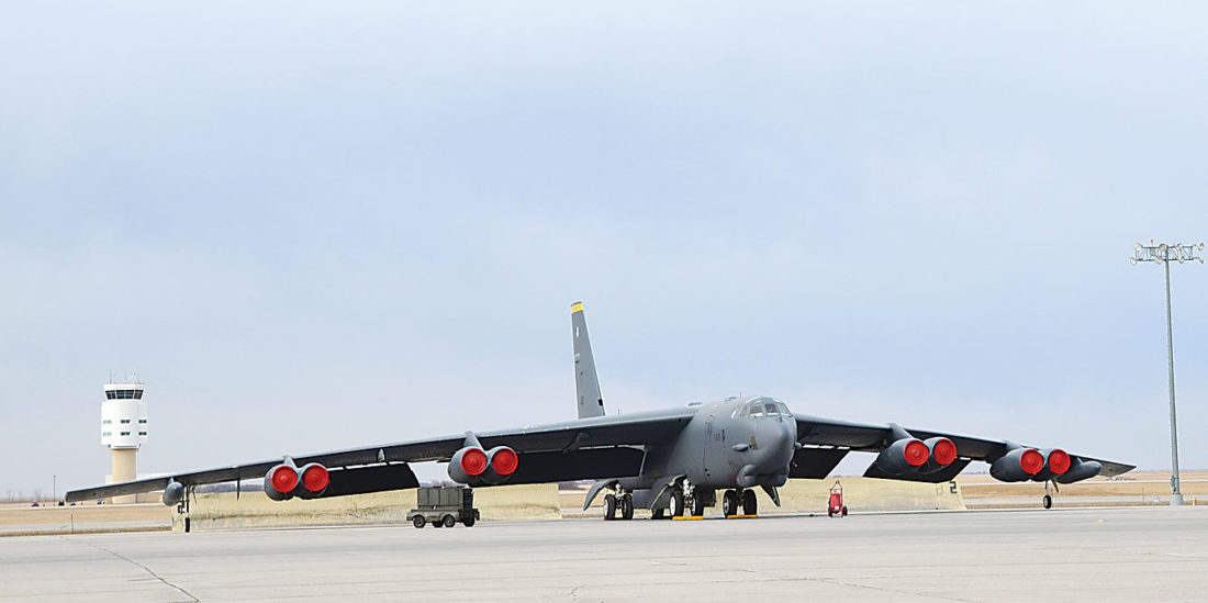 Eloise Ogden/MDN One of the eight engines on a B-52 bomber from Minot Air Force Base dropped from the plane northeast of the base while the plane was on a training mission earlier this week. The engine fell from a B-52 bomber like this one at Minot AFB.
