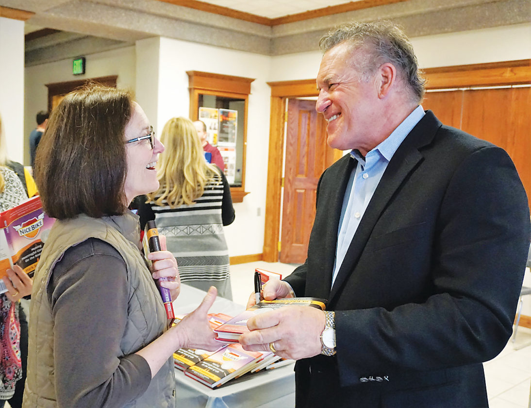 Jill Schramm/MDN Julie Rohlk, a teacher at Central High and Jim Hill and Erik Ramstad middle schools, accepts an autographed copy of “Nice Bike” from author Mark Scharenbroich at the Mid-Dakota Education Cooperative conference in Minot Monday.