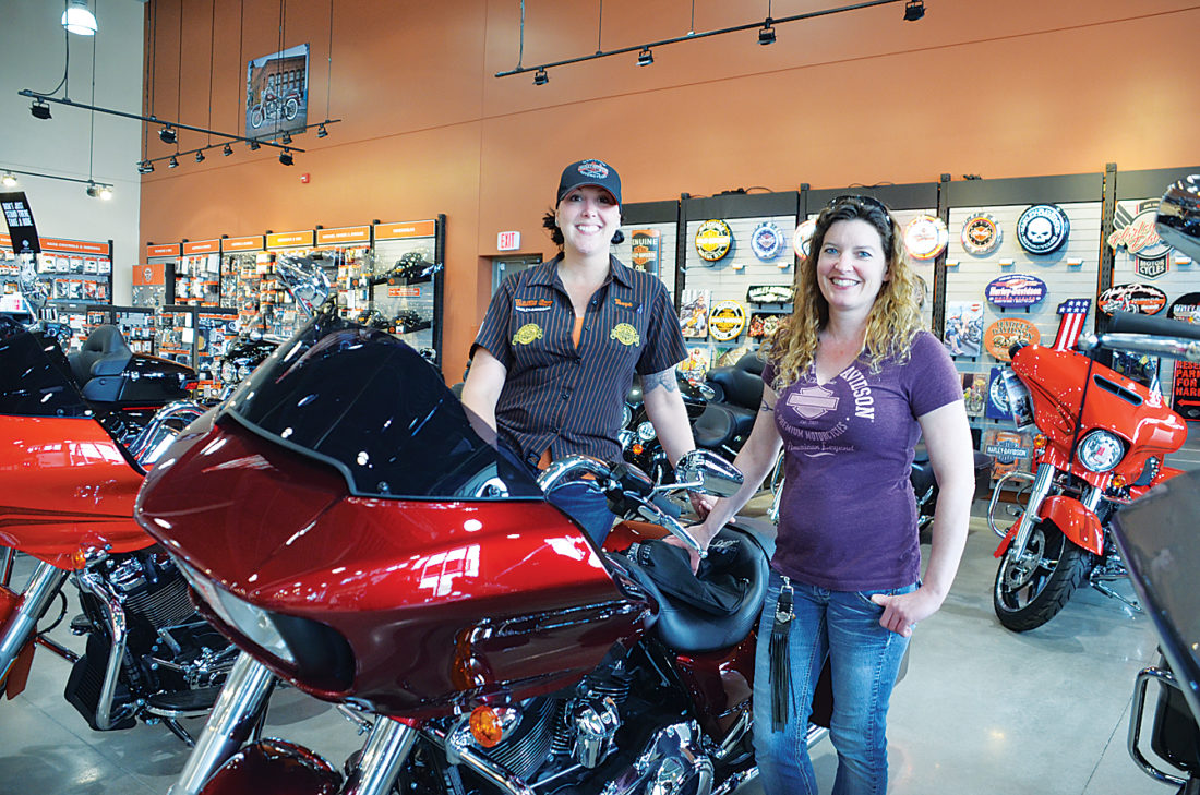 Eloise Ogden/MDN Tanya Cowart, left, sales manager, and JJ Olson, marketing director, at Magic City Harley-Davidson in Minot, are shown Monday in the store’s showroom at 6701 Highway 83 S. Magic City Harley-Davidson kicks off the riding season with Ryp to Ryder Fest, a family-oriented event in Ryder on Saturday, June 3.