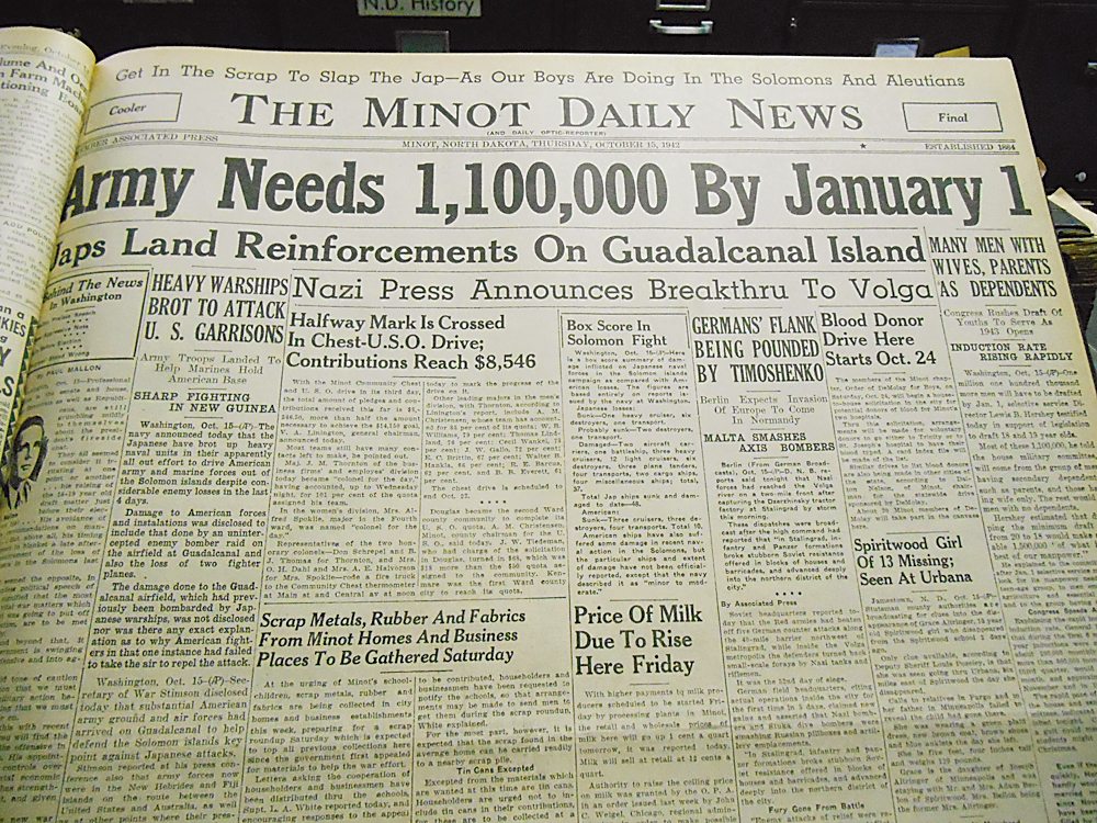 Eloise Ogden/MDN This photo shows the front page of the Minot Daily News on Oct. 15, 1942. Two days earlier, on Oct. 13, 1942, North Dakota’s 164th Infantry Regiment landed on Guadalcanal. The last reunion of the regiment will be held in Bismarck on Oct. 14, 75 years since the World War II event made the regiment famous.