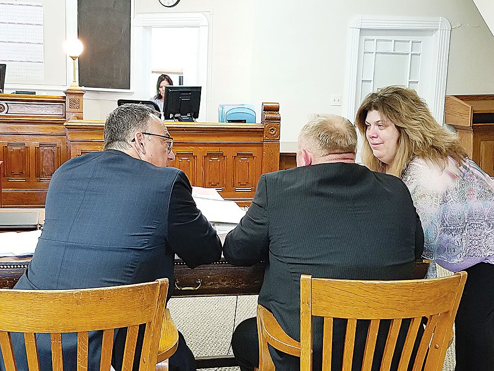 Kim Fundingsland/MDN Johnny Lawson, center, visits with his wife and attorney Peter Welte following his sentencing in a Wells County courtroom Thursday.