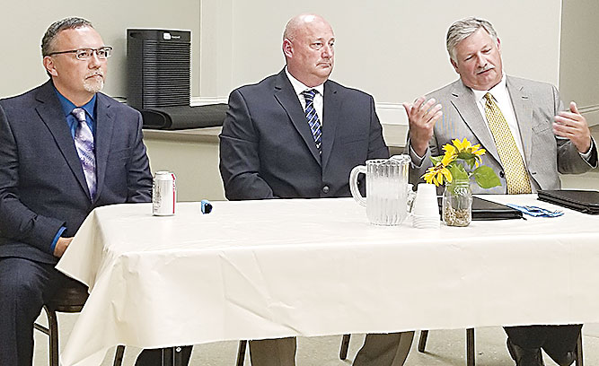 Kim Fundingsland/MDN Ward County Sheriff Bob Barnard, right, gestures while answering a question during a public forum Wednesday. Challengers in the upcoming primary election for sheriff, Michael McCloud, left and Robert Roed, center, also participated in the event hosted by the Minot Optimist Club at the Parker Center in downtown Minot.