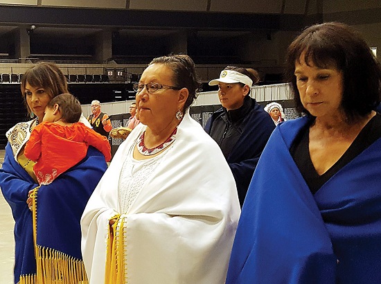Harriet Goodiron, center, who lost her son in Afghanistan in 2006, takes part in a ceremony at the 4 Bears Casino & Lodge, New Town, for the opening of the traveling North Dakota Vietnam Memorial Wall in August 2017, shown in this photo by Tony Lone Fight. The white shawl she is wearing represents a Gold Star Mother. At the left is Melanie Johnson-Luger with her daughter Ellie Luger and at right, Sharol K. Johnson, whose husband, Myron B. Johnson, died in Vietnam just before he was to return home.