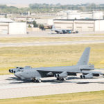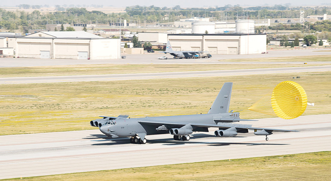 Submitted Photo A B-52H Stratofortress lands at Minot Air Force Base, Aug. 21, shown in this photo by Airman 1st Class Alyssa M. Akers Before a B-52 can land, the pilot must be in contact with the Air Traffic Control Tower to ensure the flight line is clear and safe to land.