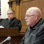Kim Fundingsland/MDN Chad Legare, right, addressed the court on his behalf during a sentencing hearing in a Towner courtroom Monday. Legare earlier entered an Alford plea of guilty to a charge of attempted murder. At left is his attorney, William Hartl, Rugby.