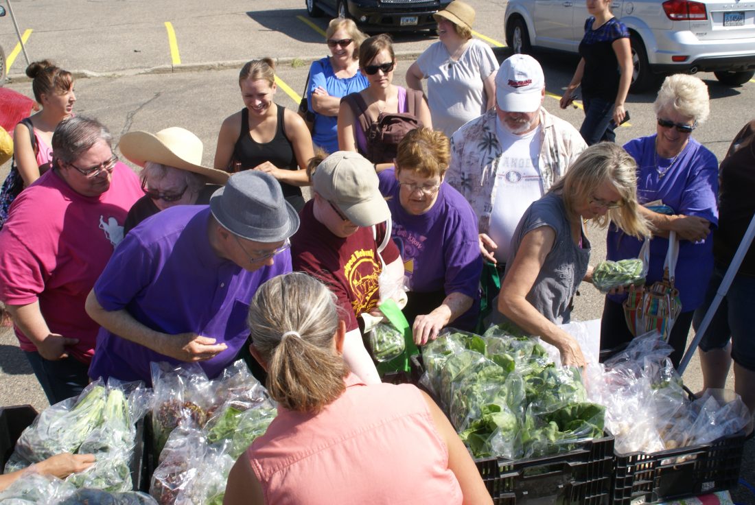 Submitted Photo The North Prairie Farmers Market offers a variety of locally grown and locally produced products. Here Peggy Walter of Cutbank Creek Produce is serving consumers.