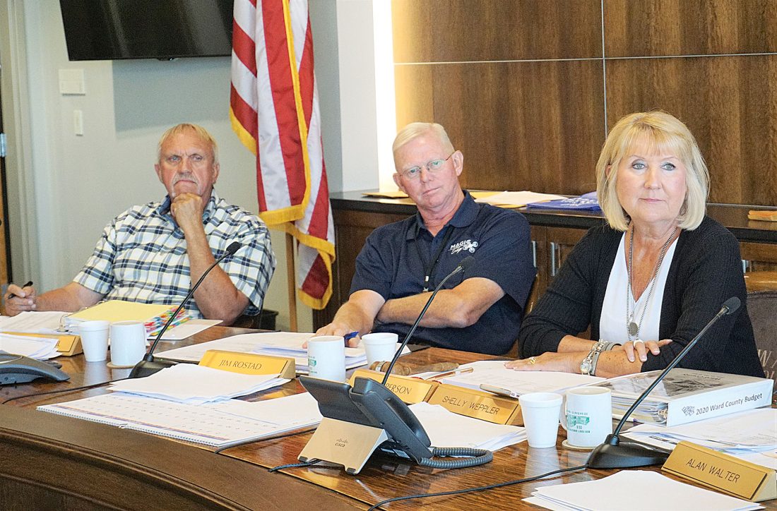 Jill Schramm/MDN Ward County Commissioners John Fjeldahl, Jim Rostad and Shelly Weppler listen during a budget discussion Tuesday.