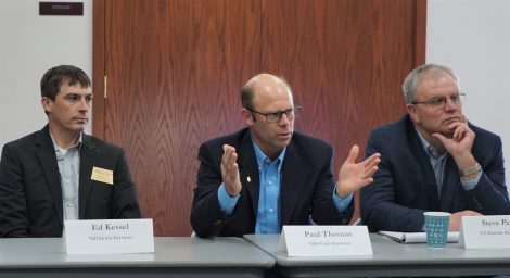 - Jill Schramm/MDN Paul Thomas with the N.D. Corn Growers speaks at a roundtable in Minot Monday, flanked by Ed Kessel with the N.D. Grain Growers, left, and Steve Perdue with the U.S. Durum Association, right.