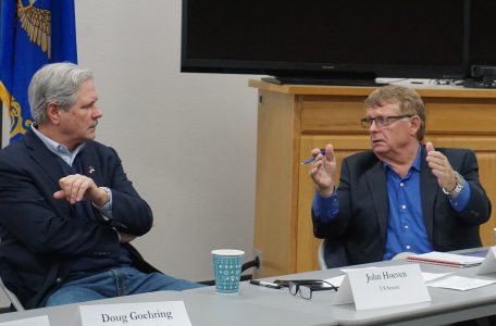 Jill Schramm/MDN Sen. John Hoeven listens to Risk Management Agency Administrator Martin Barbre at a roundtable in Minot Monday.
