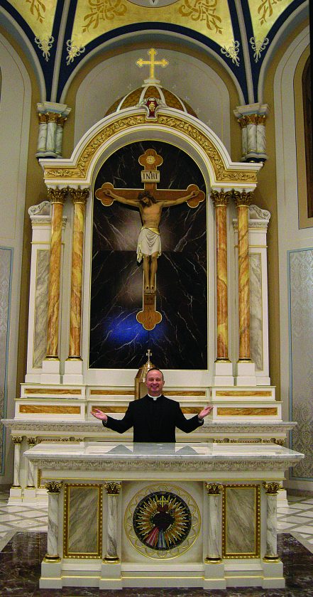 Father Justin Waltz poses at the altar at the newly renovated St. Leo the Great Catholic Church.