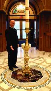 - Father Justin Waltz shows the baptismal font at the newly renovated St. Leo the Great Catholic Church.