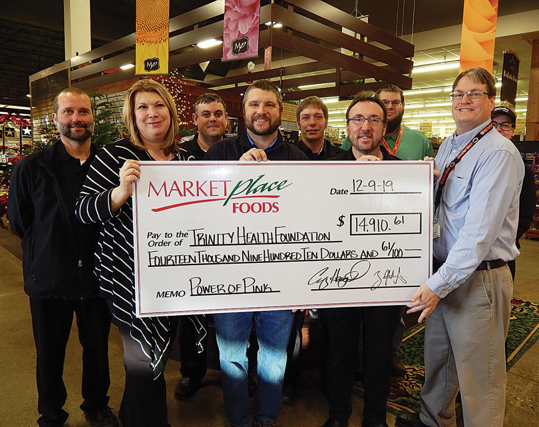 Submitted Photo Officials from Minot’s Marketplace Foods stores presented an impressive $14,910 to Trinity Health Foundation on Tuesday – the proceeds from the retailer’s Power of Pink Cake Auction held Oct. 9 at the North Hill store. Forty-eight businesses and other groups pitched in to decorate and purchase the cakes. The community coming together made it a success and a special thanks goes to the Sundsbak family for all of their hard work. The funds will go a long way to support patients enrolled in Trinity Health’s Cancer Exercise Rehab program, which offers clinical exercise and conditioning for cancer patients and survivors. South Broadway store manager Craig Heupel credited the event’s success to the tremendous effort on the part of MarketPlace Foods staff. “It’s so great to see patients participate and return the next year as survivors,” he said. “It’s working; people are beating cancer.”