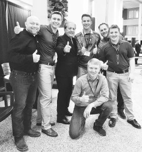 Eloise Ogden/MDN Danny Clisham poses for a photo on Monday with a group from the University of North Dakota, Grand Forks, during the Upper Midwest Aviation Symposium in Minot. From left to right are: Robert Lunnie, UND Aerospace faculty; Hunter Pearce, UND UAS student; Clisham; Jack Engstrom, David Karolinski and Scott Keane, all UND UAS students and UAS/RC Club members. At the bottom is Jordan Krueger, UND Research Institute for Autonomous Systems project manager.