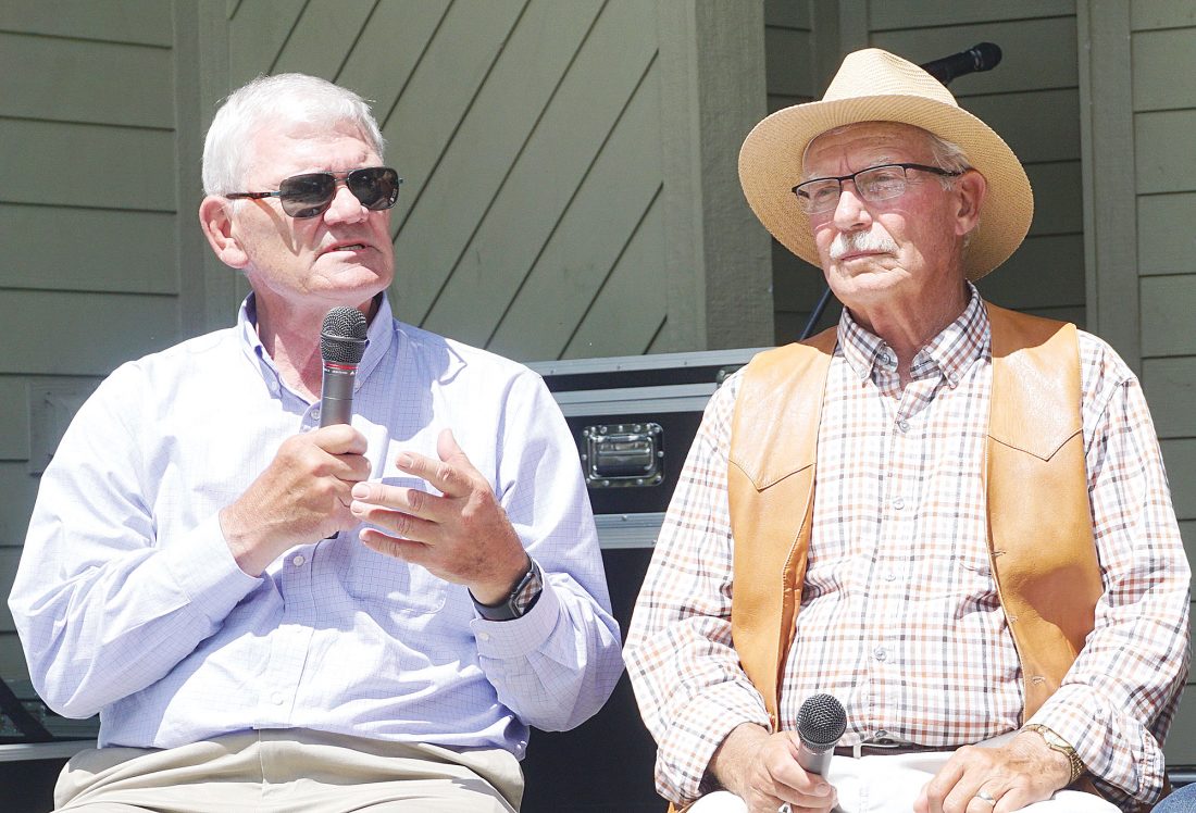 Jill Schramm/MDN Dave Sprynczynatyk, who headed the North Dakota National Guard during the 2011 flood fight, speaks at a Resilient Together panel as Alan Walter, Minot’s Public Works director at the time, listens at right.
