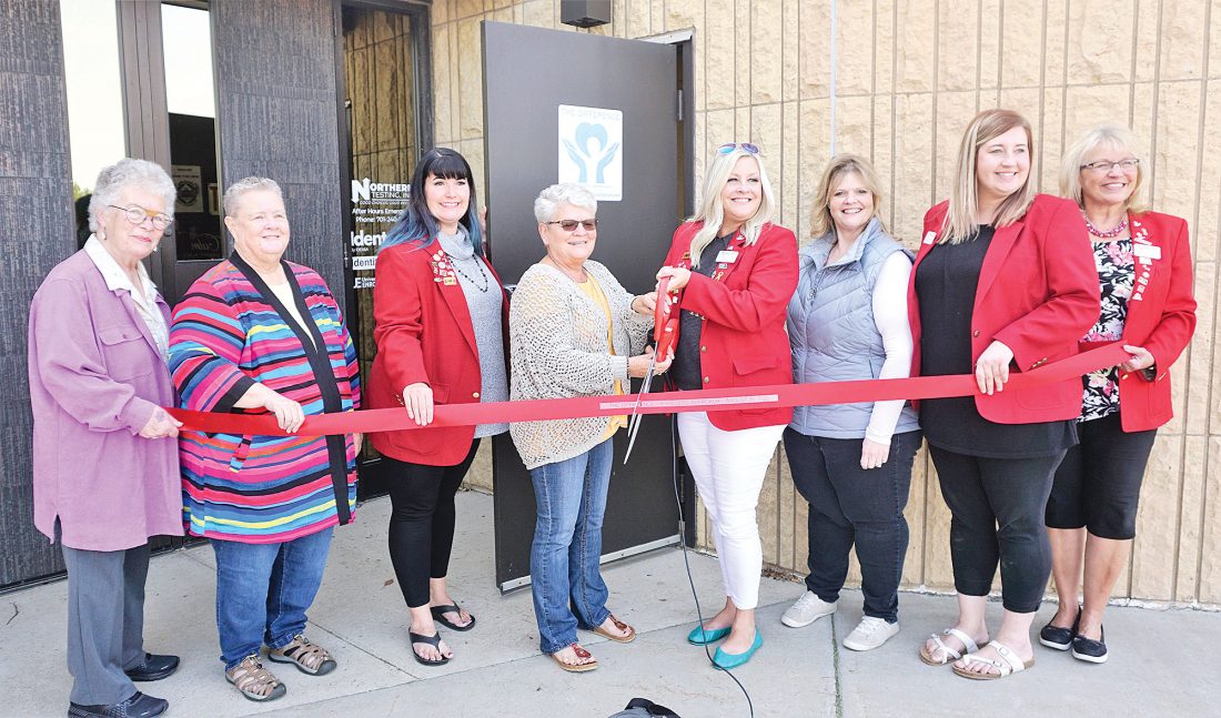 Jill Schramm/MDN Board members of The Difference–A Holistic Approach and red-coated Minot Area Chamber EDC ambassadors cut the ribbon on the organization’s headquarters in southwest Minot Wednesday. From left are Kathleen Cunningham, Dena Filler, Robbie Keelan, executive director Shelly Bohl, Keli Rosselli-Sullivan, Anna Schraeder, Lexie Kroeger and Phyllis Burckhard.