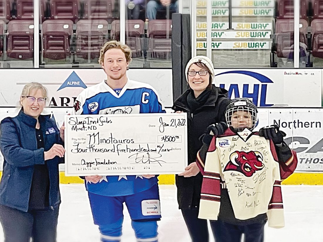 Submitted Photo Wendy Rupert, Minotauros captian Cole Mickel, Andrea Ziemer and Luke Vincent hold a symbolic check from the Sleep Inn & Suites and Aggie Foundation to the Minotauros.