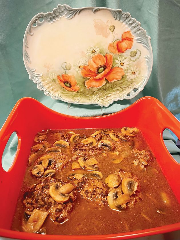 Betty had an effervescence that we all admired. Painting and its concepts came to her with ease, and she weekly rekindled our imaginations, not only with art–but cooking as well. Her farm home was busy and meals were often being prepared when we arrived. We took turns bringing lunch but this did not stop Betty from offering us small supper samples and sometime asking for advice to improve flavor. The recipe today came about because each one of us had a tip for adding flavor to Salisbury steak. The hand-painted poppy tray that is also featured in the photo was painted by my mother. Poppies were her favorite.
