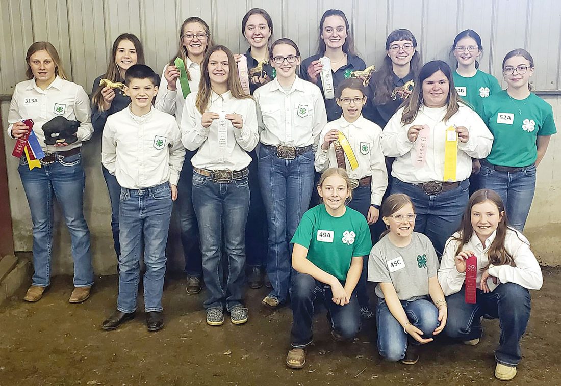 Submitted Photo Ward County 4-H State Horse Contest participants from left to right. (Back row) Mackenzie Wipf, Emily Fannik, Hailey Schauer, Olivia Lebrun, Anne Schauer, Mikaela Woodruff, and Reagan Albert. (Second row) Walter Holt, Bailey Bloms, Sadie Lemer, Nadia Lemer, Emily Merck, and Lainey Rockwell. (Third row) Sophia Lebrun, Taryn Albert, and Faith Carpenter.