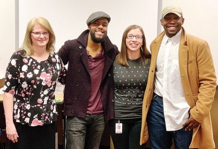 Submitted Photo Joe Davis is pictured during a past Boom Slam! with Language Arts teachers Angy Edison and Lonna Wheeler alongside former student and artist/videographer Aundre Livingston.