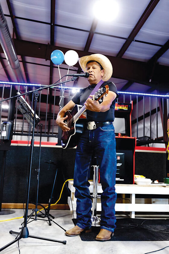 Submitted Photo Neil Hale sang while door prizes were given out during the ribbon-cutting event for the new Wolf Chief Store & More in Mandaree. Photo by Karen LoneFight.