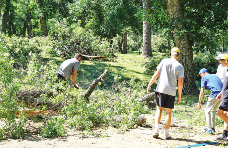 - Jill Schramm/MDN Volunteers help with cleanup Sunday at the Velva City Park, cutting up tree limbs with a chainsaw so they can be placed in piles for equipment crews to remove.