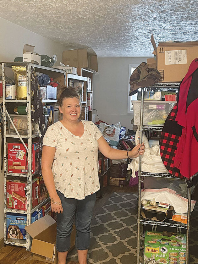 Jen Brodal/MDN Emma Phillips stands in front of her Blessed Pets food pantry basement bunker full of pet supplies.