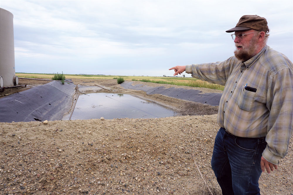 State Rep. Marvin Nelson points out deficiencies in a waste pit with liner holes and metal debris at an oilfield facility in Bottineau County during a tour Aug. 11.