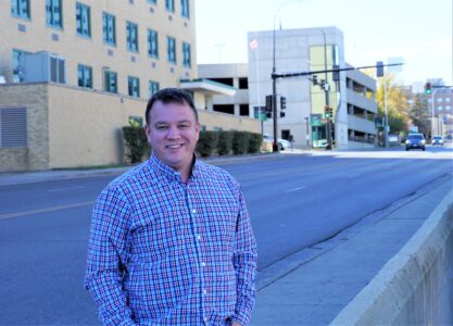 Roscoe Streyle stands along Burdick Expressway in downtown Minot. The city council candidate sees potential in the city’s downtown.
