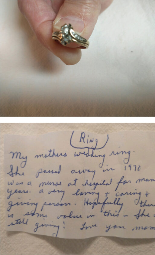 The ring was accompanied by a note, which read: “My mother’s wedding ring. She passed away in 1970. Was a nurse at hospital for many years. A very loving and caring and giving person. Hopefully there is some value in this. She is still giving! Love you mom!”