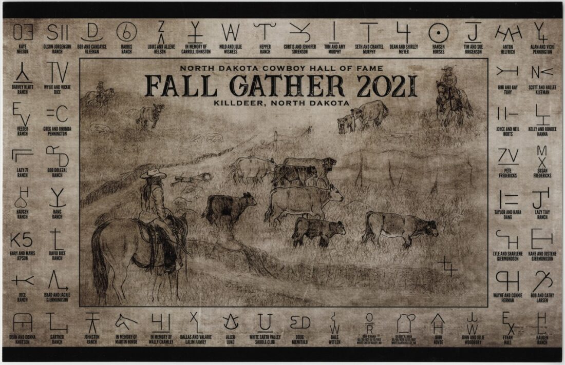 Submitted Photo Placemats with original art by Andy Knudson, of Scandia, Minnesota, and formerly of Minot and Towner, surrounded by brands, will be available at the North Dakota Cowboy Hall of Fame’s annual meeting in Minot Friday and Saturday.