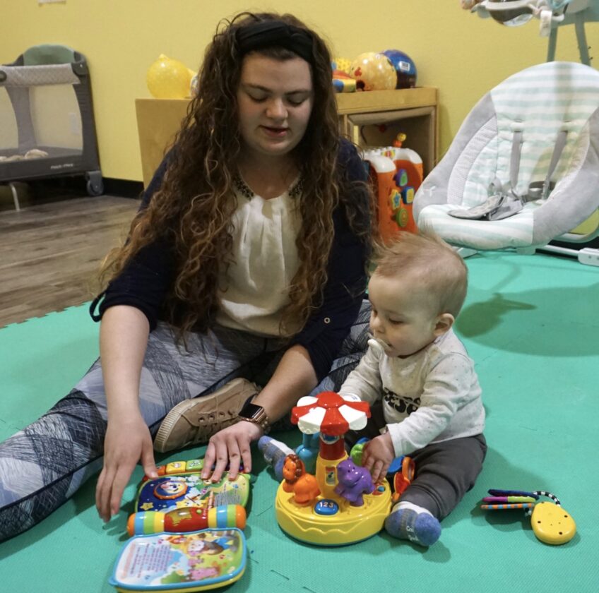 Jill Schramm/MDN Katie Roskelley, a caregiver with Magic City Day Care Center, plays with a child at the center Wednesday. The region has been growing in part due to the number of infants being added to the population.