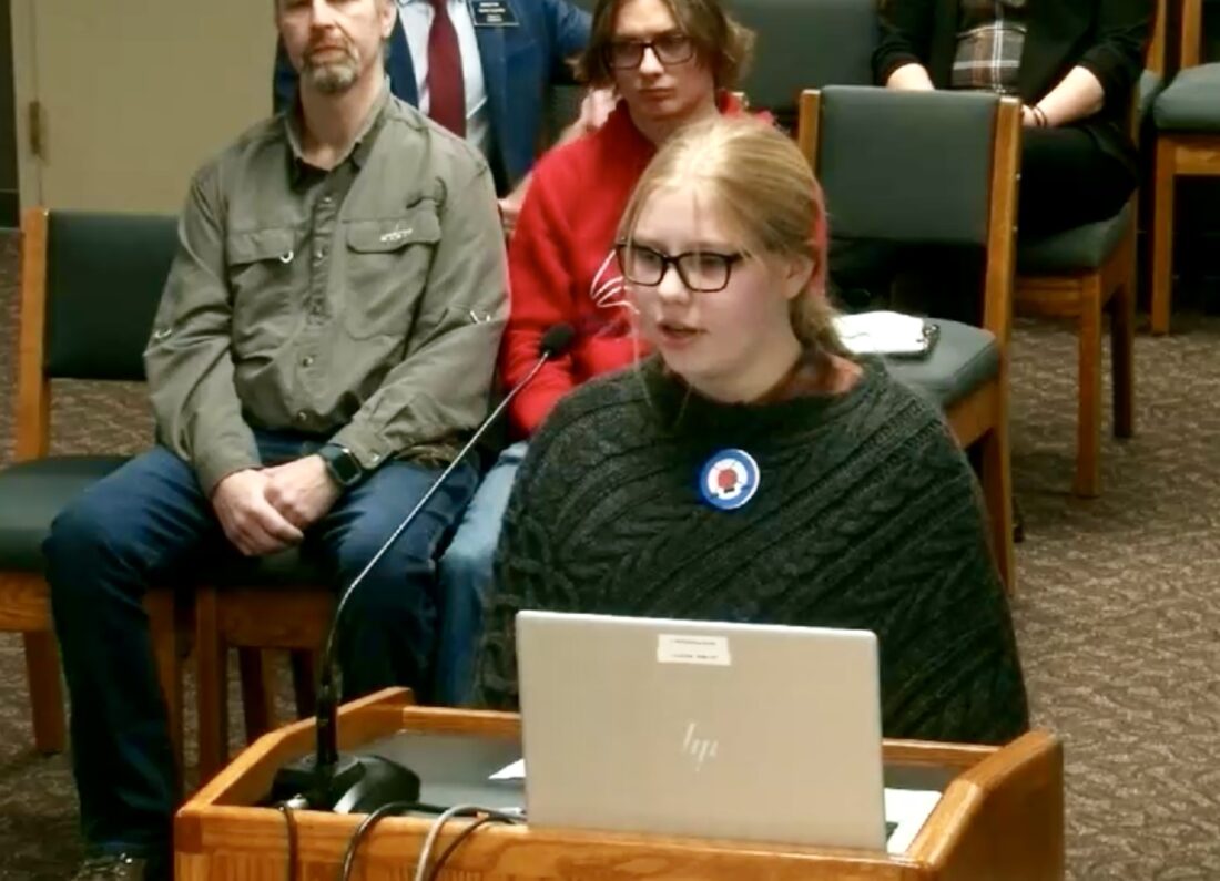 laina Schmit of Bismarck speaks to the Senate Education Committee Jan. 18 in support of designating curling as the state sport.