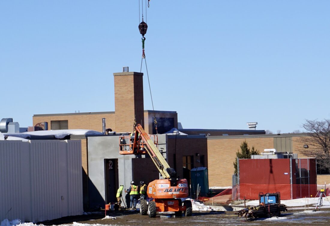Jill Schramm/MDN Contractors began erecting the auxiliary gymnasium on the east side of Magic City Campus Monday. The gym is among changes occurring ahead of the transition of the two-year high school to a four-year high school for grades 9-12. The transition will coincide with the opening of the Minot North campus in the fall of 2024.