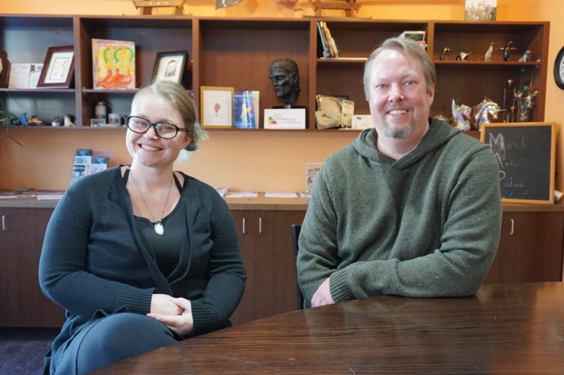 Jill Schramm/MDN Chandell Lattin with AmeriCorps and Justin Anderson, executive director, work together to provide programming at Minot Area Council of the Arts. Through the Community Builder program of Souris Basin Planning Council, MACA was able to obtain a second staff member.